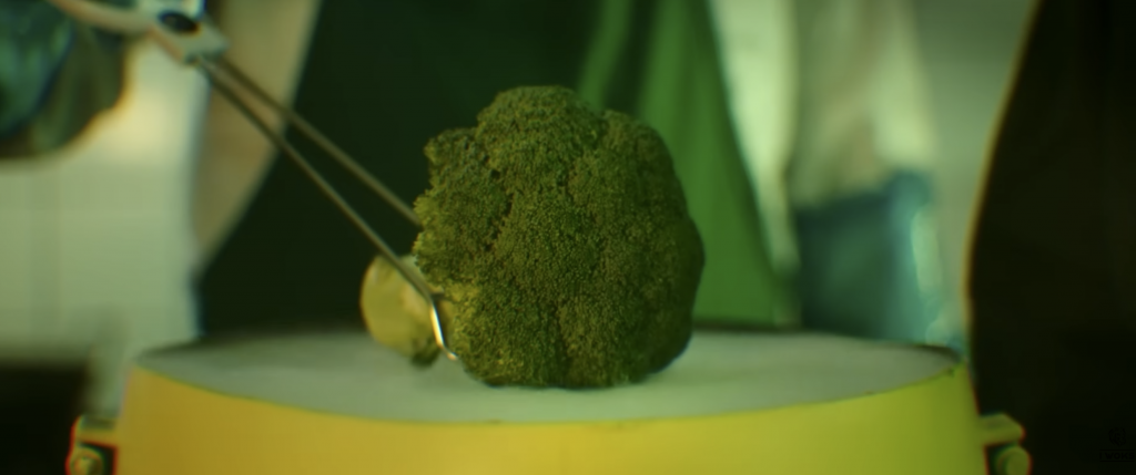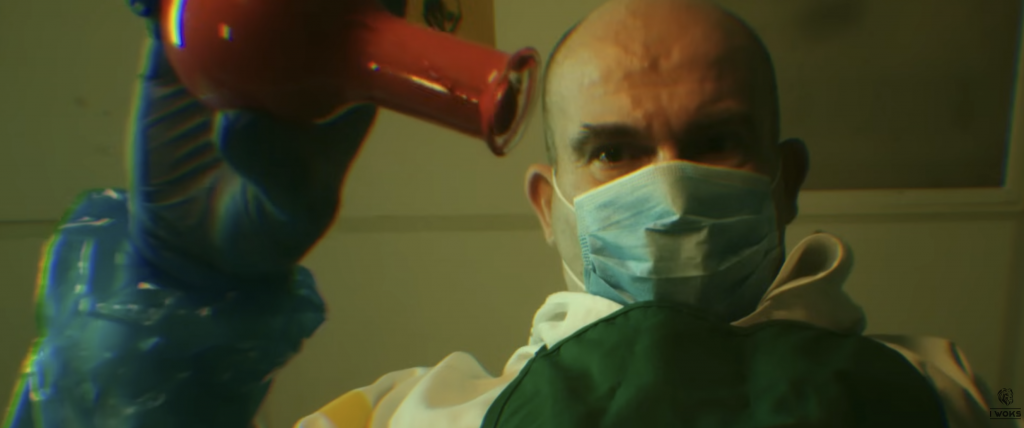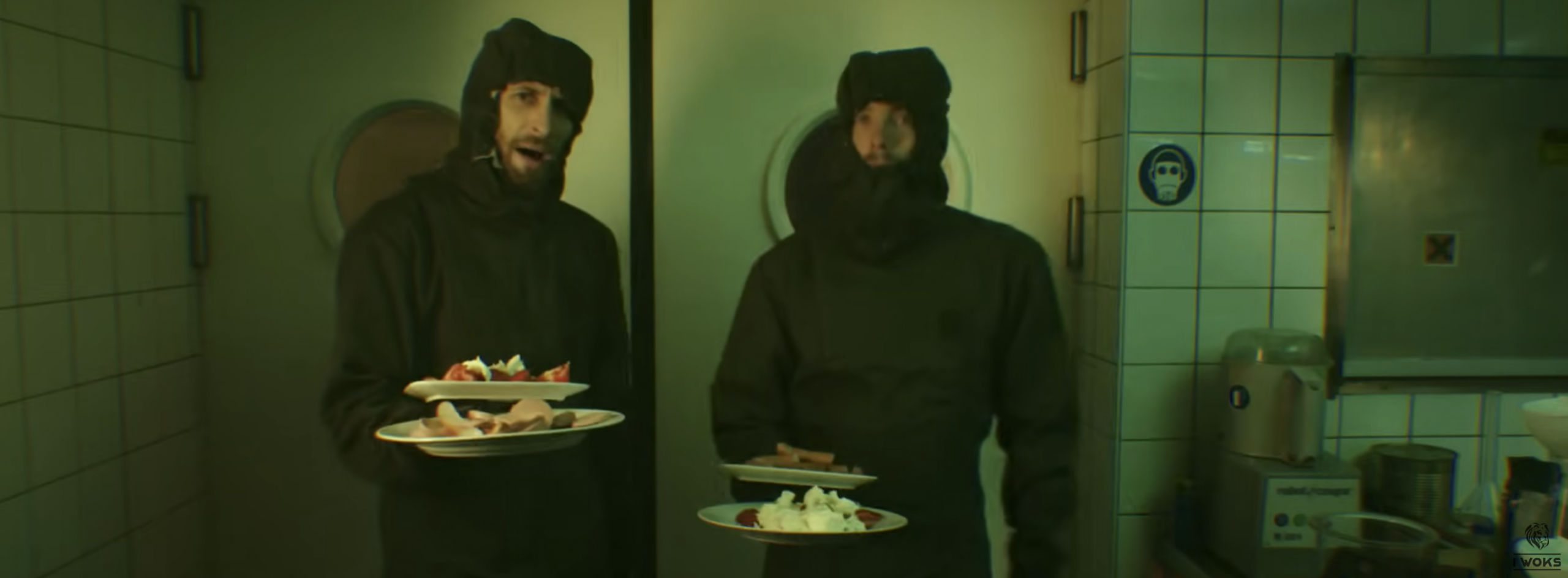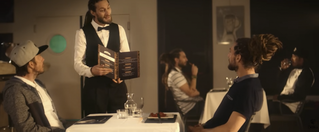 Dans un restaurant, les membres du groupe incarnent tous le même personnage, comme un consommateur interchangeable, docile, pris dans un système. En cuisine, la réalité est tout autre : aliments difformes, gestes mécaniques, atmosphère malsaine. Un envers du décor brutal, presque grotesque, qui contraste avec le calme apparent de la salle.